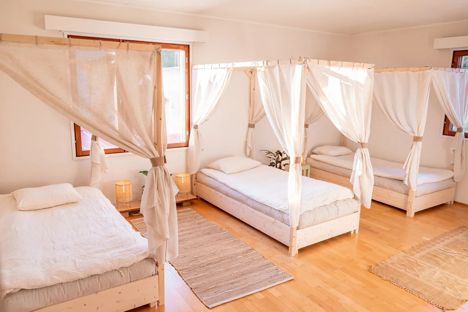 You’ll stay in shared 2–3 person rooms with futon beds. Each bed has its own privacy curtain. Fresh towels, bed linens and bathrobes are included in the price.